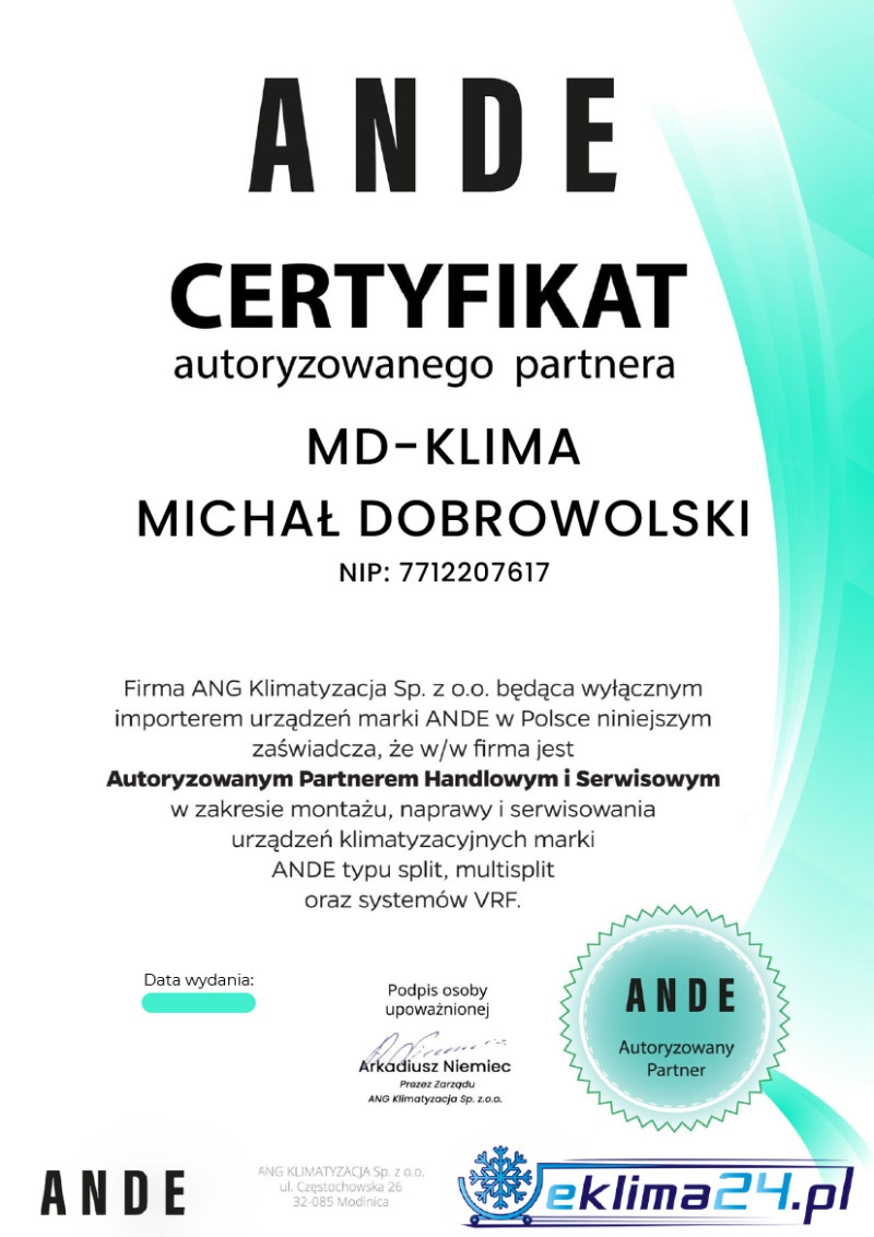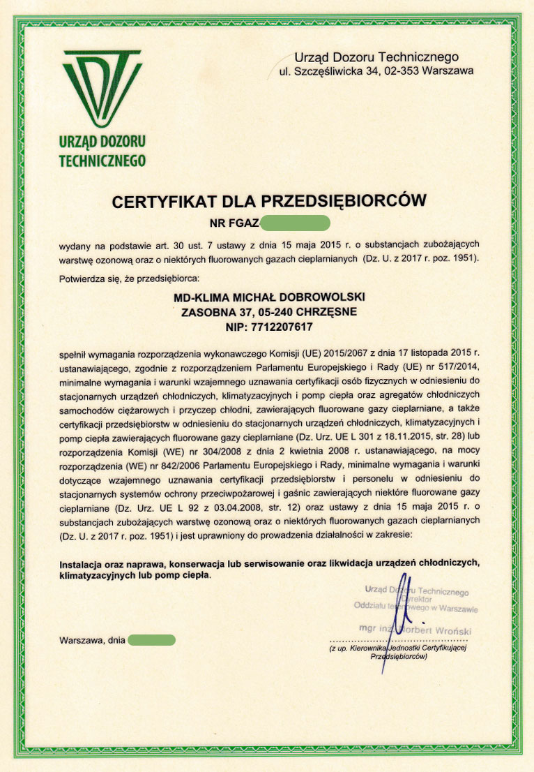 Posiadamy niezbędne uprawnienia oraz certyfikaty, potwierdzające nasze kwalifikacje dotyczące montażu i serwisu klimatyzacji.